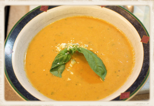 Tomato Blue Cheese Soup Tomato Blue Cheese Soup : Roast the tomatoes, onion, and garlic for about 45 minutes to an hour, until they start to get brown and caramelize.